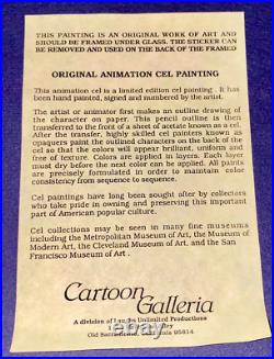 This Warner Bros Cel features the beloved character Bugs Bunny and was signed by famous animator Chuck Jones. The artwork is a great addition to any collection and perfect for fans of Looney Tunes and animation in general. The cel and includes a hard signed autograph by Chuck Jones. The cel is part of the Looney Tunes & Merrie Melodies franchise and is categorized as animation art and collectibles. And the cel type is a classic hand-drawn animation cel. This piece was created by the Warner Bros. Animation Studio and is a must-have for any animation enthusiast. "Rare" Low Early Limited Edition. Hand Signed by Chuck Jones. Measures 20" x 18" framed and matted in good condition...