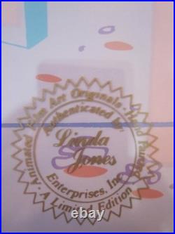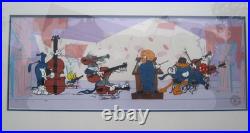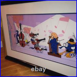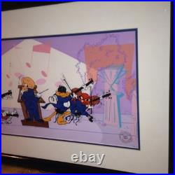 You may want to replace that piece or strip the frame and paint it otherwise Both frame and matting is in very good condition. ARTWORK INFORMATION Presentation: Comes triple matted in blue, red, and white; Signature: Signed in black Sharpie by Chuck Jones Edition: Numbered 212/750 Size: 11 3/4 x 31 3/4 inches, Frame size: 21 x 41 inches Authentication: Linda Jones Authentication seal, lower right corner, Linda Jones is the artist's daughter Year published: 1989 Animation Cel and Matting in good Condition. Bugs Bunny Cel Warner Brothers Quintet Daffy Duck Signed Chuck Jones Cell Rare.