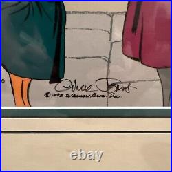 Chuck Jones signed original sericel featuring Warner Bros' characters Bugs Bunny, Daffy Duck, and Elmer Fudd in an anime style. Titled "Cheers, " this hand-painted cel artwork from the 1990s is a collectible piece of Looney Tunes franchise memorabilia. Has authentication stamp and certificate of authentication on back. Top of the picture frame is chipped.