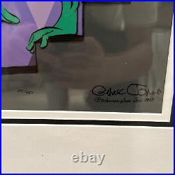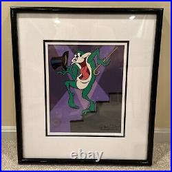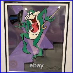 The product is a Chuck Jones signed hand-painted animated cel featuring the character Michigan J Frog from the Looney Tunes franchise. It is a sericel artwork from the 1990s, produced by Warner Bros. The cel is an original piece and comes with authentication.