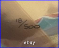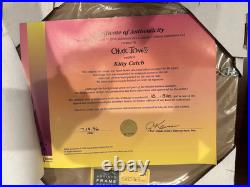 This Chuck Jones signed "Kitty Catch" animation cel is a limited edition piece from Warner Bros' Looney Tunes franchise. Produced in 1996 in the United States, it features the character Kitty Catch in a Western Animation style. The cel is framed and includes a certificate of authenticity, indicating its authenticity as an original production piece. It is part of a limited edition of #18/500 cels, making it a rare collectible item for fans of animation art.