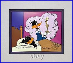This wonderful limited edition cel features Daffy Duck dreaming of his Daffy-shaped Academy award! It was created using original Chuck Jones artwork. The overall mat size is approximately 17.5" x 15.5" with an aperture size of 12" x 9 3/4". The cel size is 10.5" x 12.5". Older mat, but very expensive one. The Linda Jones COA has a 4 long thin blemish line across it. Let us send you an invoice.Once you pay for them we cannot combine them. While we do not do digital appraisals we are happy to answer questions you might have or consider your item for consignment. And, as always, we will treat you how we want to be treated - with the highest level of customer service of any gallery. WE ARE FANATICAL ABOUT PACKAGING.