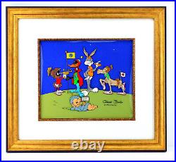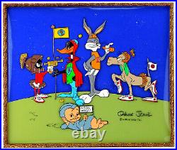 Approx a 47 year old cel. 1st appearance in a limited edition of. Bugs Bunny, Marvin the Martian, K-9, Porky Pig and Daffy Duck. The classic image was inspired by the The Return of Duck Dodgers n the 24 1/2 Century. The very first limited edition created for retail by Chuck Jones.