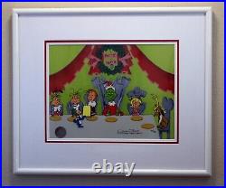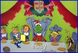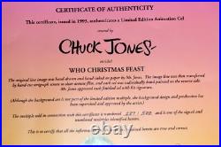 Item: Hand Painted and Signed Animation Cel featuring "How the Grinch Stole Christmas". Description: Featuring a magnificent signed limited edition hand-painted cel from animator, director and producer Chuck Jones. The COA includes the following description: Limited Edition Animated Cel (1993), "Who Christmas Feast" (featuring Cindy Lou Who and her Whoville friends).