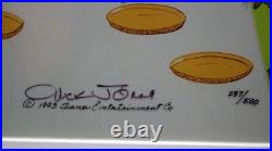 The original line image was hand-drawn and hand-inked on paper by Mr. The image line was then transferred by hand-cut serigraph screen to clear acetate film, and each cel was individually hand-painted on the reverse side. Jones approved each finished cel with his signature... Although background art is not part of the limited edition multiple, the background design and production has been surprised and approved by the artist. Includes 8.5" x 11" Certification of Authenticity (Certification Serial Number #: 35871) as personally signed by Linda Jones Clough (as Linda Jones), daughter of Chuck Jones, on behalf of Linda Jones Enterprises.