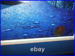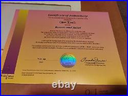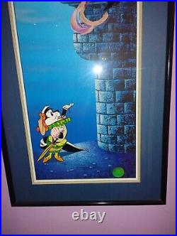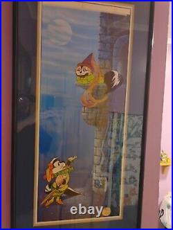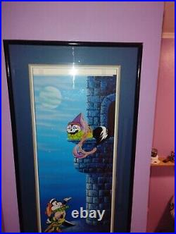 The cel is a licensed reproduction from 1992 and measures 21" in length and 41.25" in height. The item is framed and comes with a certificate of authenticity, matte, numbered, and color reproduction background included. This cel is #273 of 500 produced. Certificate included, has a small tear in paper backing(shown in photo) and appears the print is falling inside the frame(see photo).