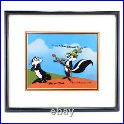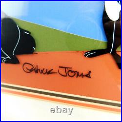 A classic and handsome hand painted cel illustrated by Chuck Jones. A rare and early representation of the hand work of Chuck Jones (Pepe Le Pew creator). Hand signed in a bold signature and includes COA. Aged frames may have scuffs and are not newly framed.