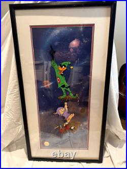 Rare Chuck Jones Signed Limited Edition Cel - "Duck Dodgers Finale" (1993) - Warner Bros. I'm liquidating my entire animation art collection- please see additional photos and my other listings. Daffy Duck, Porky Pig & Marvin the Martian - Iconic Scene from "Duck Dodgers in the 24½ Century" Limited Edition #176/ 750. Own a piece of animation history! This original Chuck Jones hand-signed limited edition cel, titled. Captures the legendary final scene from the 1953 Looney Tunes masterpiece. Duck Dodgers in the 24½ Century. This rare and highly sought-after Warner Bros. Limited edition cel recreates the hilarious climax of the classic short, where Daffy Duck (as Duck Dodgers) and Marvin the Martian destroy Planet X, leaving only a tiny scrap floating in space. Official Authentication: Features the Linda Jones Enterprises gold seal & comes with a Certificate of Authenticity. Unframed Cel Size: 13.5" x 33" inches?? Framed Size: 22" x 41" inches. Frame is as-is condition due to age. Why This Collectible is a Must-Have. Hand-Signed by Chuck Jones - A rare opportunity to own an authentic piece of.