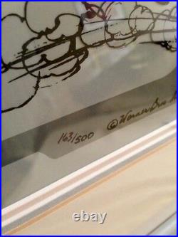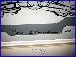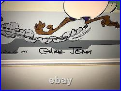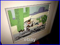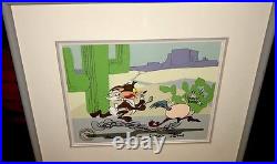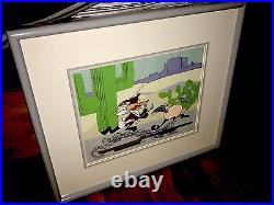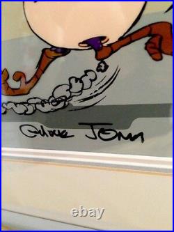 Coyote in a playful chase with his nemesis, Roadrunner. This piece is a treasured collectible for animation enthusiasts, embodying the classic animation tradition. Adding to its uniqueness, this cel is personally signed by the legendary Chuck Jones, renowned for his work on these beloved characters. The autograph is hard-signed directly on the cel, ensuring authenticity and a direct connection to the heart of animation history. Proudly made in the United States, this piece is a must-have for any serious collector or fan of the franchise. "BABY CHASE" Featuring the baby RoadRunner and baby Coyote Hand Signed by Chuck Jones. Comes framed and matted and in good condition... We do not mark merchandise values below value or mark items as "gifts" - US and International government regulations prohibit such behavior. Feel free to ask questions... Also check out our inventory as we will be adding some great, RARE pieces to the store!