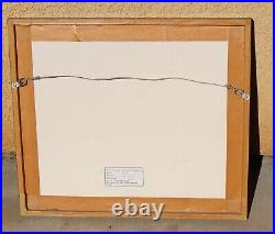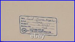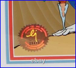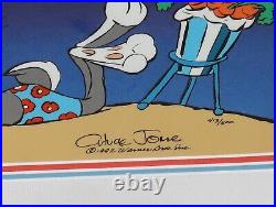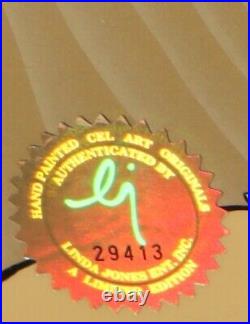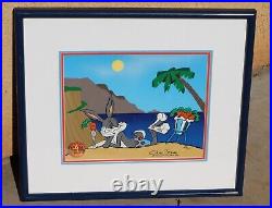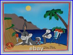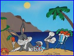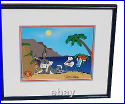 Note: The Golden seal turned orangey when I took sun photos outside. The back of the frame has a label: Distributed by Circle Art Corporation. The scene shows Bugs Bunny lounging on a tropical beach with a glass of carrot. This work does not have a paper COA but the seal on the lower left of the piece itself acts as authentication.