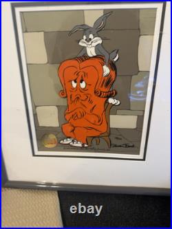 Bugs Bunny Gossamer Chuck Jones signed limited edition cel is a collectible animation art piece that showcases the character Gossamer from the Bugs Bunny franchise. This original cel is a 1992 production and is signed by the illustrator, Chuck Jones It is a limited edition piece, numbered 118 out of 500. The cel features the Haredresser theme and is an authentic Warner Bros.