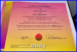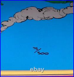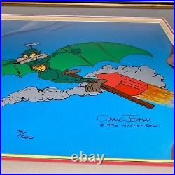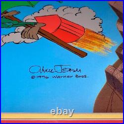 Cel Signed by Chuck Jones. Framed and matted Cel measured 17" x 20"... Ard measures 4" x 5". These Edition Cels and high quality promotional cards were issued to galleries by Warner Brothers to promote limited edition cels. A Rare Gallery Promo Card comes with this Edition Cel. Laminate on the frame is lifting, as shown in the photos... Cel matting and promo card all in good condition. We do not mark merchandise values below value or mark items as "gifts" - US and International government regulations prohibit such behavior.