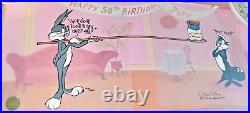 Cel featuring Pepé Le Pew, celebrating his 50th birthday and signed by Chuck Jones. This animation cell is a valuable collectible from the Looney Tunes franchise, created by Warner Bros. Animation Studio in the United States.