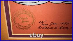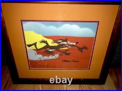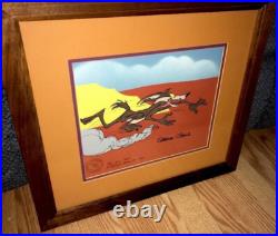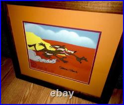 "HOT PERSUIT" Hand signed by Chuck Jones which is not on every number edition making this piece even more rare. Eleased in 1983 one of Chuck Jones earliest Road Runner Coyote Editons. Authenticated on the cel By Linda Jones, Enterprise Inc. Comes Professionally framed and matted, size 7/8" T x 17 1/4"W x 19 1/8L A very Highly sought after scarce Edition.