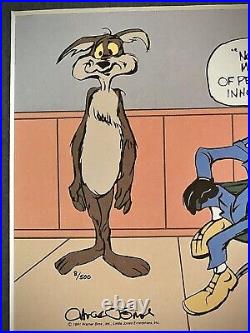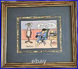This rare piece of Warner Bros. Animation art features the iconic characters Wile E. Coyote and Daffy Duck, signed by Chuck Jones in hard ink.