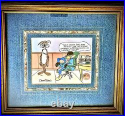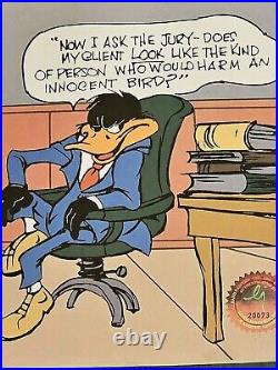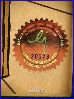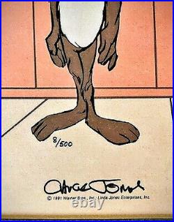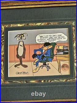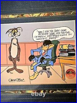 The autograph format is accompanied by a framed and numbered limited edition cel painting 8/500 produced in 1991 and certified by Linda Jones Enterprises, Inc. The piece is perfect for collectors of animation art and merchandise, and is a must-have for fans of the Daffy Duck franchise. Made in the United States, this item is a unique addition to any collection and is as new condition. OFFERS ARE TAKING UNDER CONSIDIRATION AT THIS TIME. Featuring DaffyDuck, Wile E Coyote.Comes Framed an Has the Linda Jones Notary stamp on the Hand Painted cel. And c Jones hard ink signature. Measures framed 12" x 12". Comes as shown in the photo.